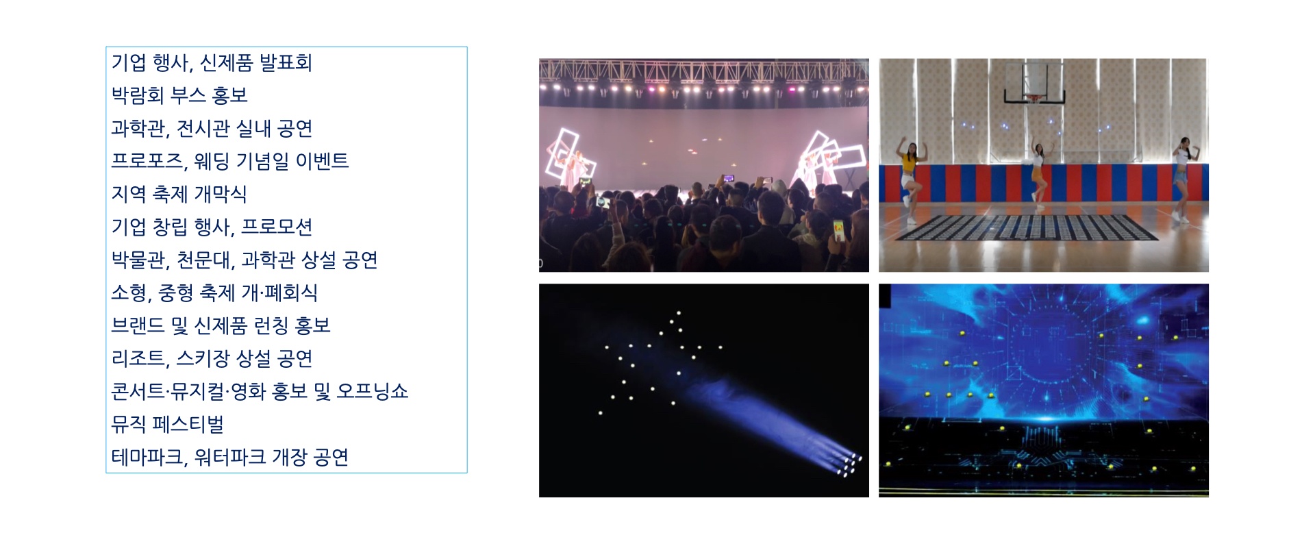 • 축제 및 행사 : 지역별, 시즌별 충ㄱ제 및 행사 개/폐회식, 불꽃축제, 에어쇼 등 스카이쇼 콜라보레이션